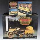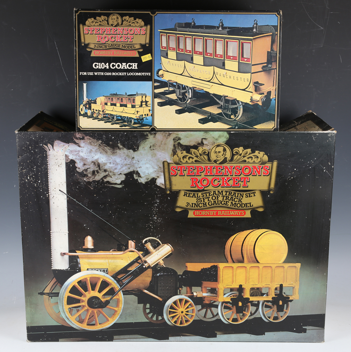 A Hornby Railways 3½ inch gauge live steam Stephenson's Rocket locomotive and tender, boxed with track, instructions and funnel, together with a G104 coach, boxed (unchecked, boxes creased, torn and scuffed).