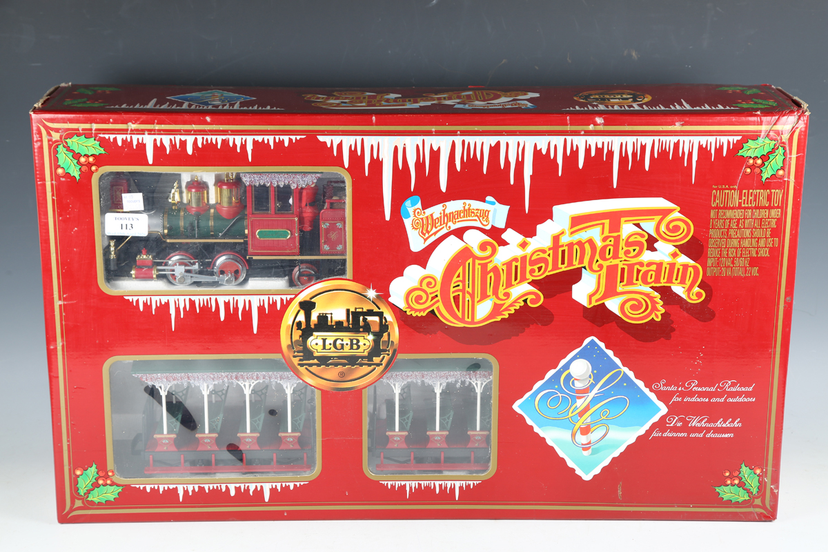 An LGB G gauge Christmas Train set, comprising locomotive, two open coaches, track and controller, together with a No. 94005 open truck, a No. 21010 truck, a No. 80090 buffer stop and a No. 10600 part-set of straight track, all boxed (boxes damaged).
