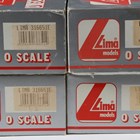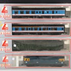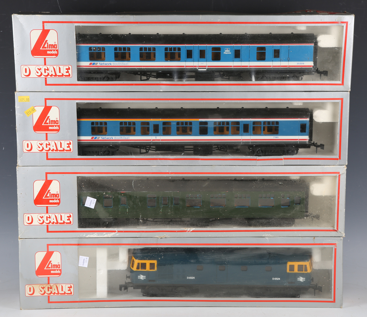 A Lima O gauge No. 216577 Class 33 diesel locomotive in BR blue, together with three No. 316651E coaches (one repainted green), all boxed (boxes creased, torn and scuffed).