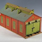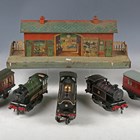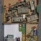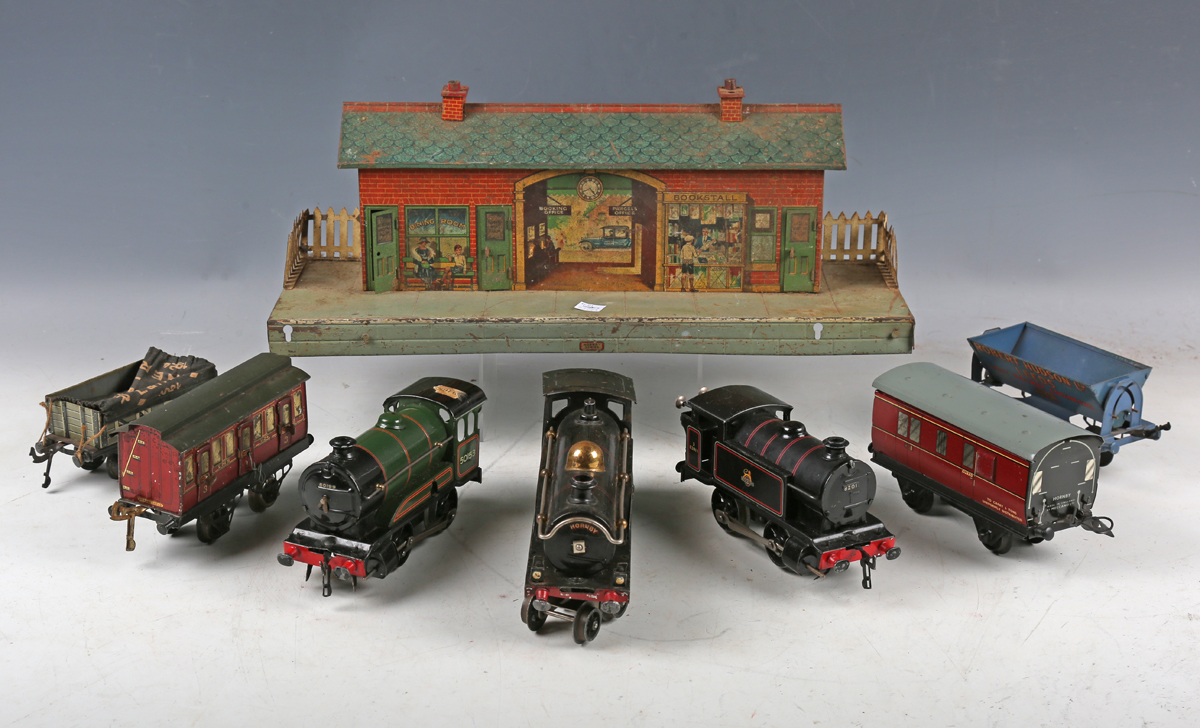 A collection of Hornby O gauge railway items, including clockwork 4-4-0 locomotive and tender 2711 in LNER black, tank locomotive 82011 in BR black, Pullman coach, snow plough LMS, breakdown van and crane, other goods rolling stock, Windsor station and signal box, double track engine shed, track and trackside accessories (playwear, faults, some parts missing), together with a Dinky Toys No. 152 Austin Devon in green over cerise, a No. 151 Triumph, a No. 427 Fordson truck and Britains petrol pumps and accessories (playwear and paint chips).