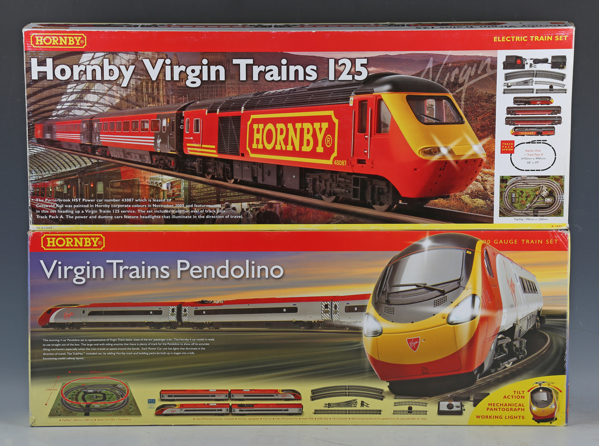 Two Hornby OO gauge train sets, comprising R1080 Hornby Virgin Trains and R1134 Virgin Trains Pendolino, both boxed with TrakMats (contents still tissue-wrapped, boxes lightly creased, torn and scuffed).