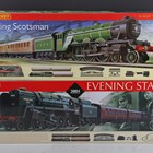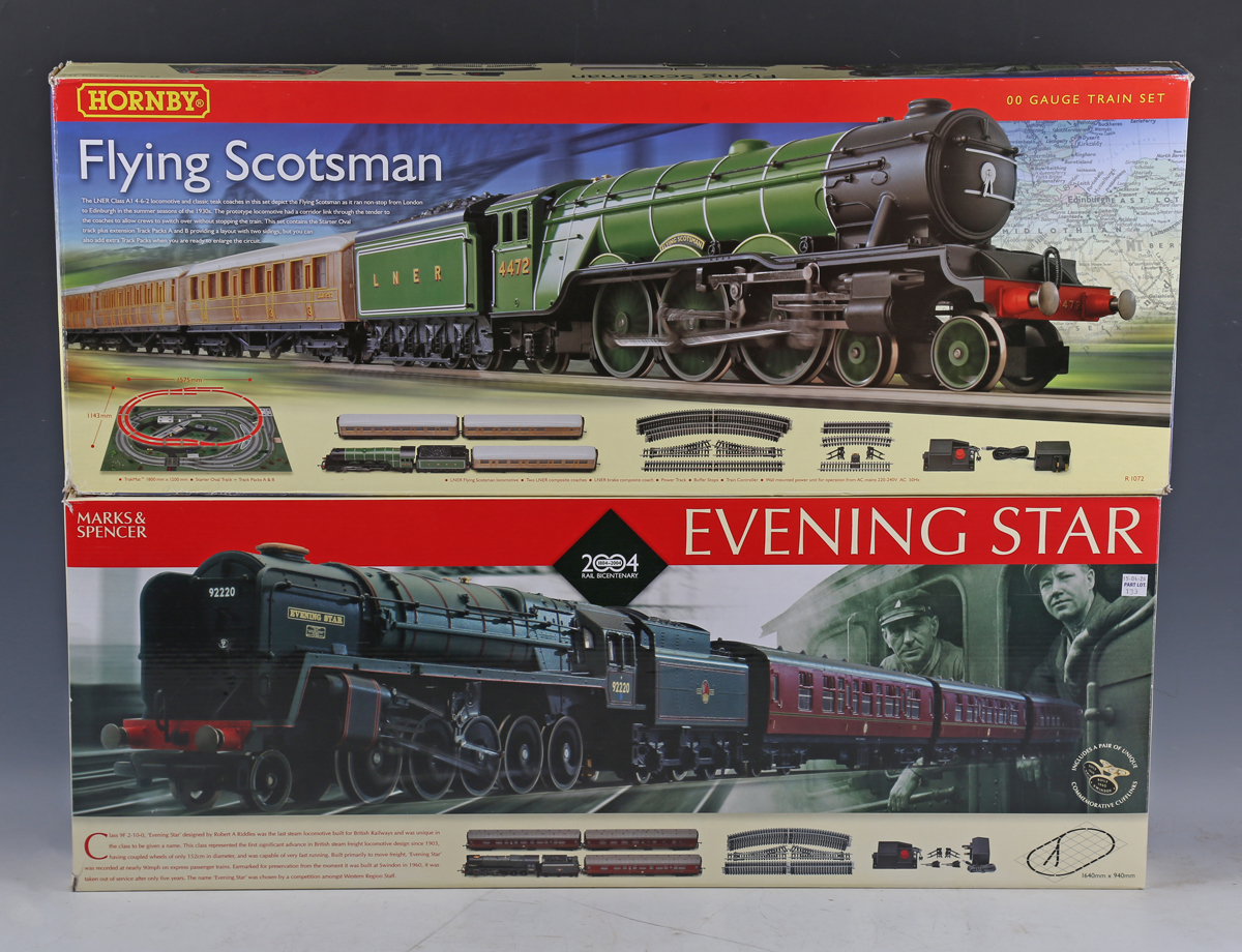 A Hornby OO gauge R1072 Flying Scotsman train set, boxed with TrakMat, together with a Hornby Marks and Spencer OO gauge R1052 Evening Star 2004 Rail Bicentenary 1804-2004 train set, boxed with TrakMat (boxes lightly creased, torn and scuffed.