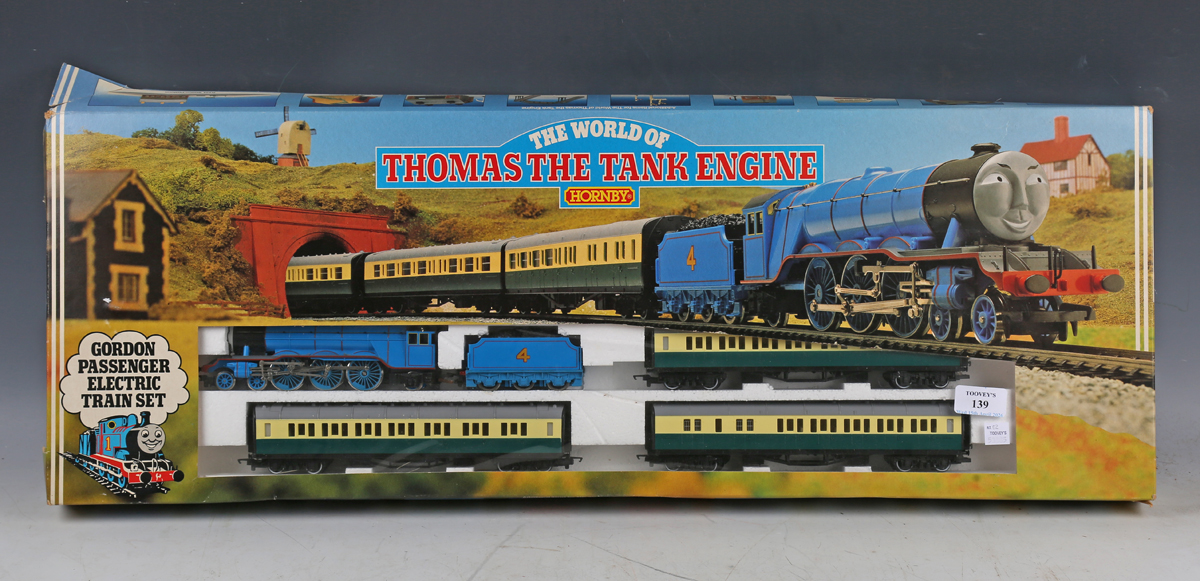 A Hornby OO gauge The World of Thomas The Tank Engine R.137 Gordon Passenger Train Set, together with an R.852 James The Red Engine, an R.351 Thomas The Tank Engine, an R.110 Annie, an R.112 Clarabel coach and four items of goods rolling stock, all boxed (boxes creased, torn and scuffed).
