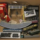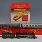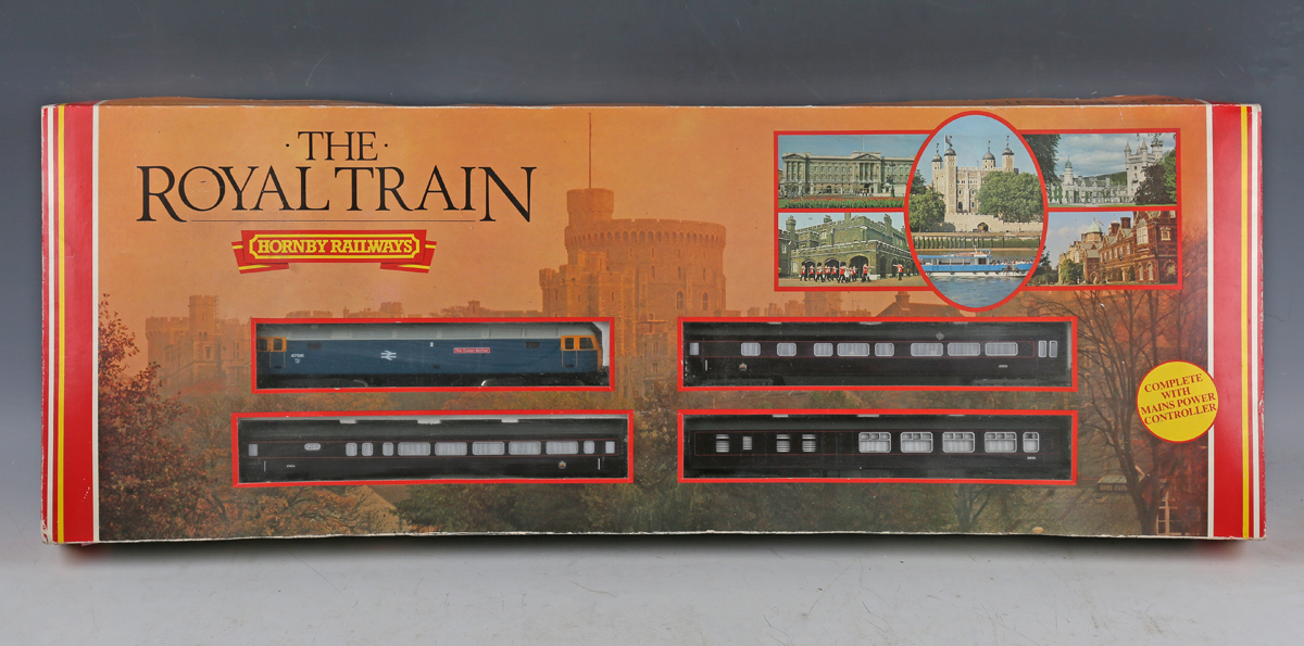 A Hornby Railways OO gauge R.557 The Royal Train set, comprising diesel locomotive 'The Queen Mother', coaches, track and controller, together with another Hornby locomotive and tender, Tri-ang Railways coaches, goods rolling stock, an American type steam locomotive and tender, track and trackside accessories, including buildings, boxed and loose (playwear, unchecked, boxes creased, torn and scuffed).