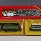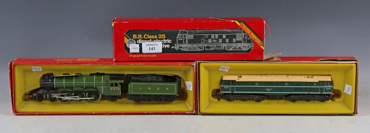 A Hornby Railways OO gauge R.054 Pacific locomotive 4472 and tender in LNER green, together with an R.357 diesel electric locomotive in BR green and a Class 25 diesel electric locomotive in BR blue, all boxed (boxes damaged).