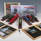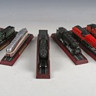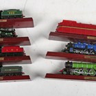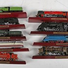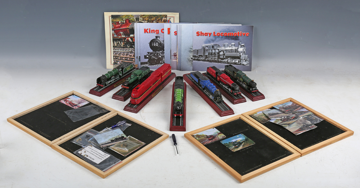 A group of Atlas Editions model steam locomotives, including 'Royal Scot', 'Shay' and 'Castle Duchess', with information booklets, magazine and Atlas Editions Locomotive Legends metal plaques, within wooden display boxes.