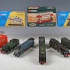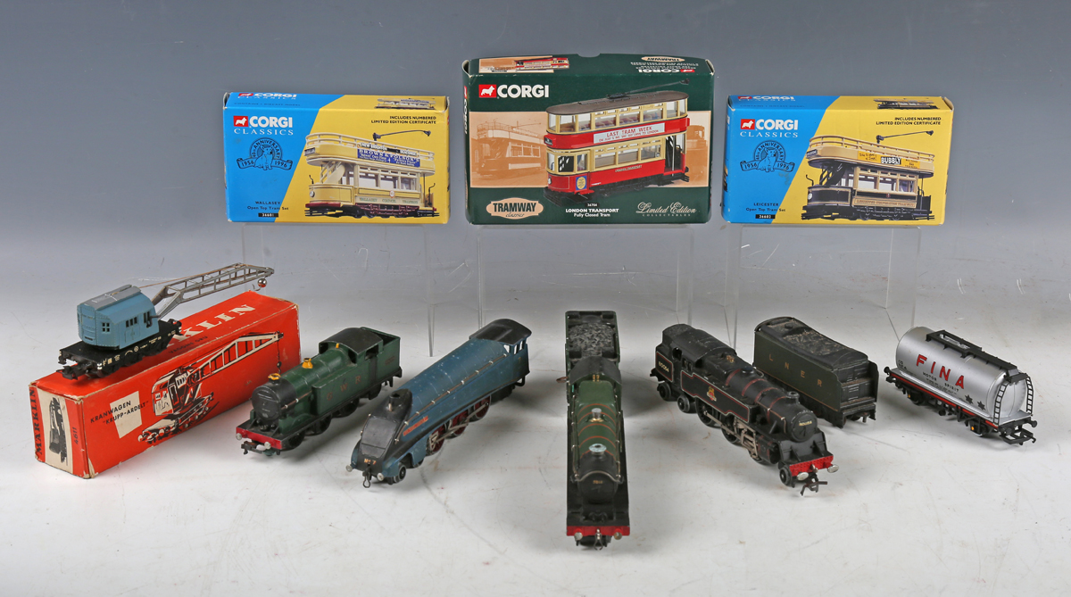 Three Hornby Dublo three-rail locomotives, comprising 'Sir Nigel Gresley' and tender, tank locomotive 6699, repainted in GWR green, and tank locomotive 80054 in BR black, together with a Hornby Dublo two-rail locomotive 'Bristol Castle' and tender, a Märklin crane truck, a Hornby tanker, three Corgi trams, two sets of points and a Ratio distant signal set.
