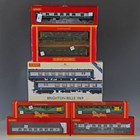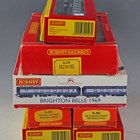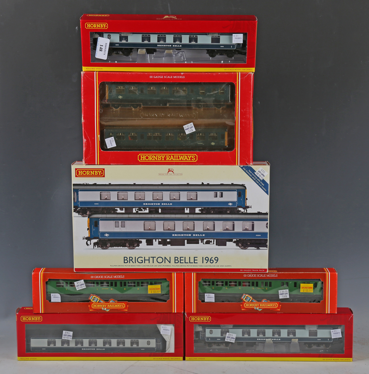 A Hornby OO gauge DCC Ready R.2988 Brighton Belle 1969 two-car set, boxed (one bogie missing from dummy car, polystyrene damaged), together with three Brighton Belle coaches, comprising R.4528 1st, R.4529 1st and R.4527 3rd, and a collection of other Hornby and Hornby Railways OO gauge items, including R.267 VR 2-car DMV Class 110 set in BR blue, five tank locomotives, four boxed, R.1087 Venice Simplon-Orient-Express part train set, R.369 train pack BR 3-car diesel set (lacking diesel car), two Southern coaches, two Pullman coaches, Inter-City 125 parts, locomotive 'Cheshire' and tender, and goods rolling stock, boxed and loose (playwear and parts missing), together with a group of Hornby and Hornby Railways boxes.