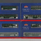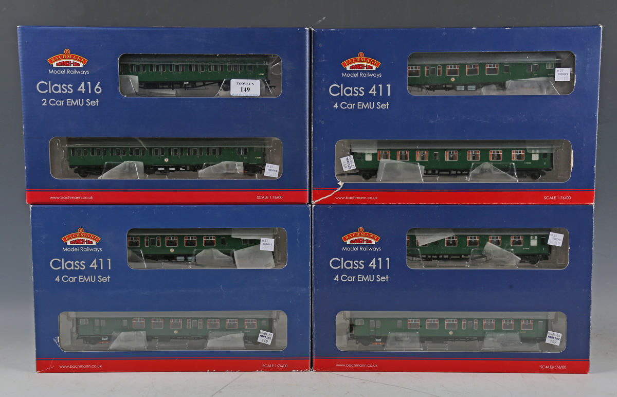 A small group of Bachmann Branch-Line OO gauge railway items, comprising two No. 31-425 4CEP EMU 7105 sets, No. 31-426 4CEP EMU 7126 set, No. 31-376 2 EPB EMU 57710 set, all in late Southern green livery, and No. 33-827 25 ton Queen Mary brake van, all boxed, together with a well wagon and two locomotive boxes.
