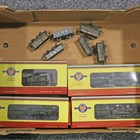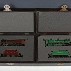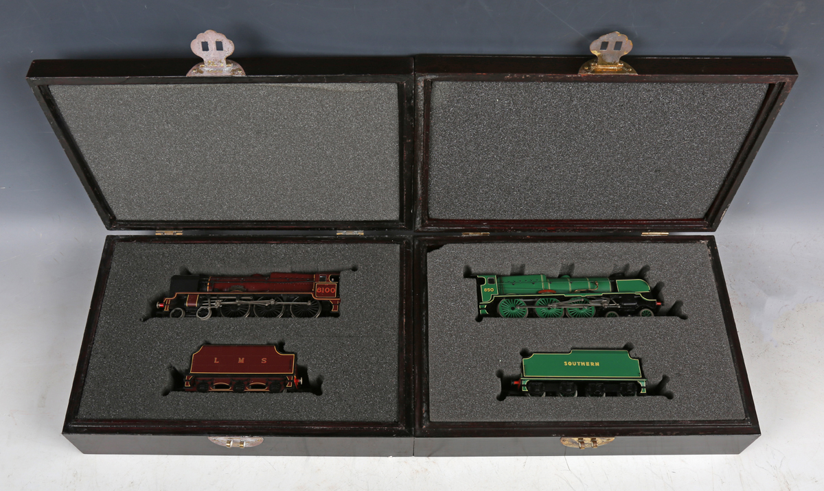 Three Oxford Rail OO gauge locomotives and tenders, comprising Dean Goods 2534 with snow plough, Dean Goods 2309 and Dean Goods 2475, all in Great Western livery, all boxed, together with an Adams Radial tank locomotive, boxed, two Bachmann Branch-Line locomotives and tenders in Southern and LMS liveries, within wooden display cases, and six goods wagons (some boxes damaged).