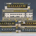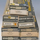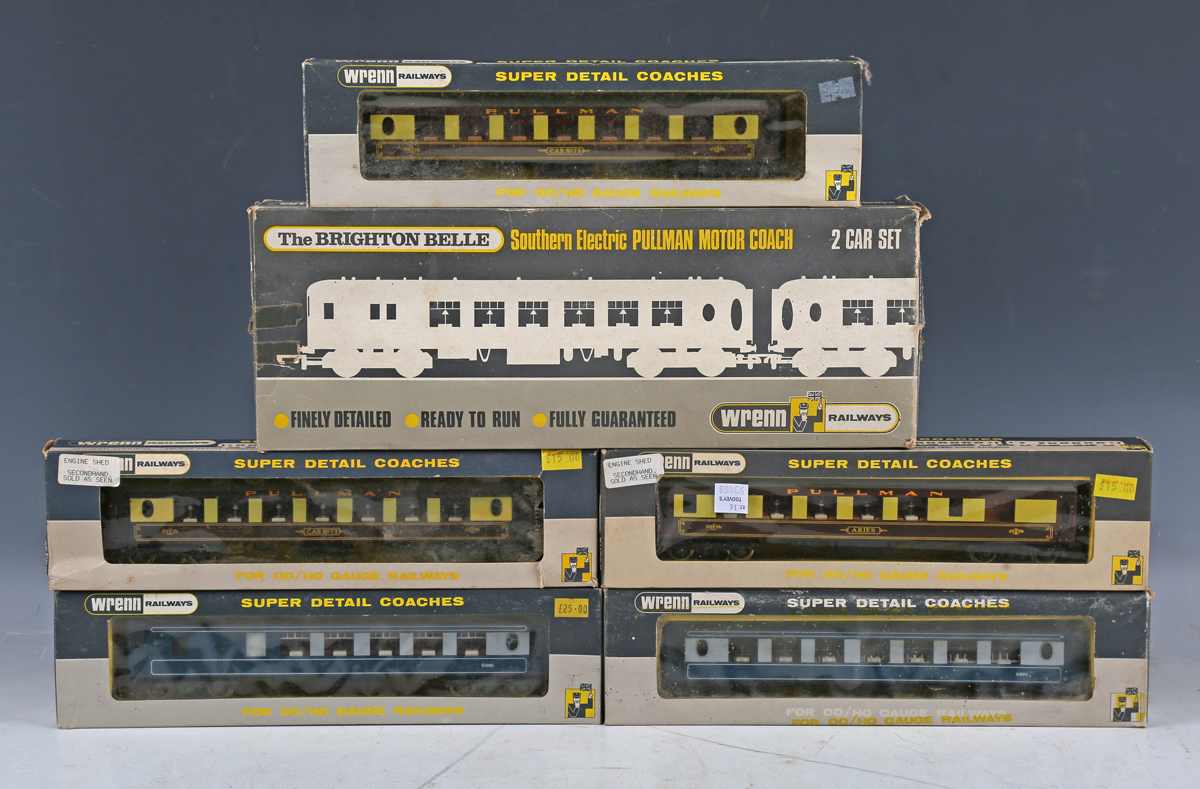 A Wrenn OO/HO gauge W3004/5 The Brighton Bell two-car set, together with two blue and grey Pullman coaches and three brown and cream Pullman coaches, all boxed (Brighton Bell box damaged and lacking one interior box).