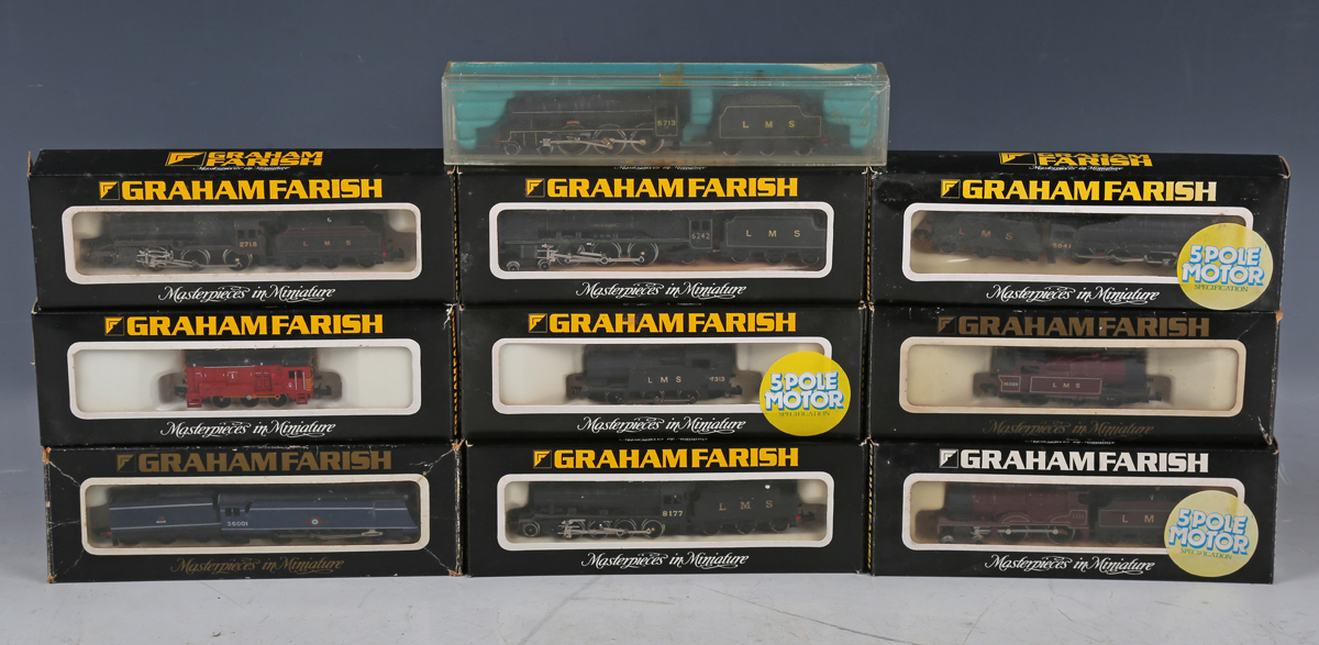 Six Graham Farish N gauge steam locomotives and tenders, comprising No. 1507 'Merchant Navy' in BR blue, No. 1811 'City of Glasgow' in LMS black, No. 1901 Class 8F in LMS black, No. 1201 4P Class in LMS maroon, No. 1851 2715 'Crab' in LMS black and No. 1801 Class Five in LMS black, together with two tank locomotives, a No. 1706 general purpose tank in LMS black, a No. 1701 general purpose tank in LMS maroon, a No. 1006 08 Class diesel 'Thomas 1' in BR red and a Peco locomotive 'Renown' and tender in LMS black, all boxed.