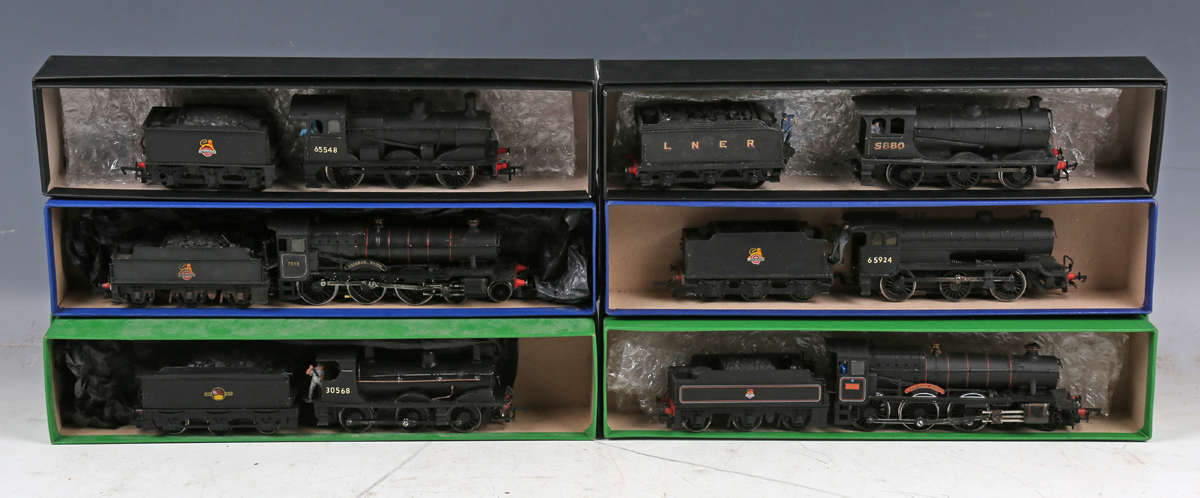 Twenty-four OO gauge locomotives and tenders, including Hornby, Bachmann Branch-Line, Lima and Tri-ang, all in black liveries, including BR, LNER and Southern, some weathered, nine in stock boxes.