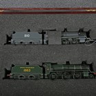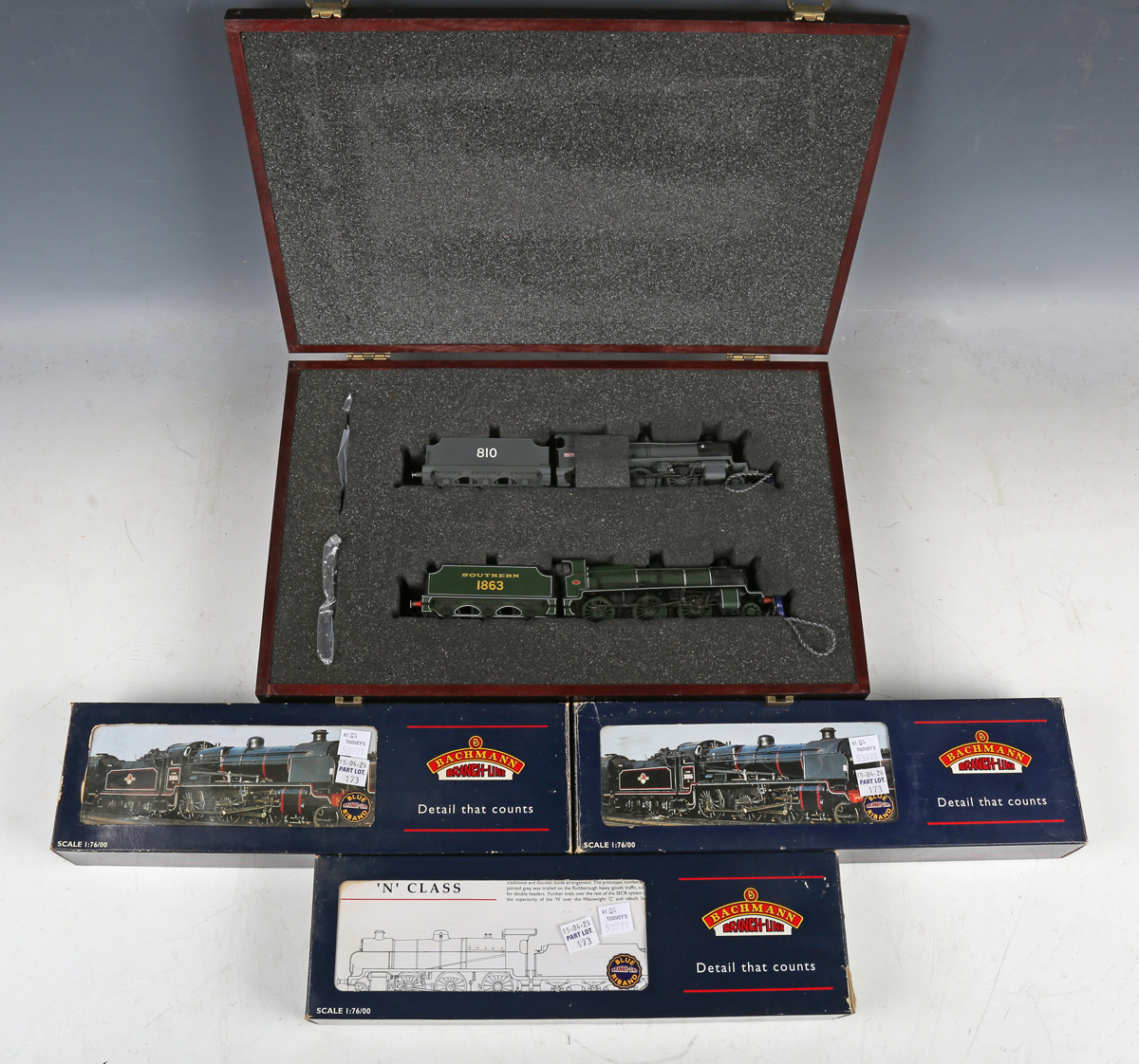 A Bachmann Branch-Line OO gauge limited edition set of two N Class locomotives and tenders, one in Southern green, the other in WD grey, cased with certificate and instructions, together with three other N Class locomotives and tenders, all boxed.