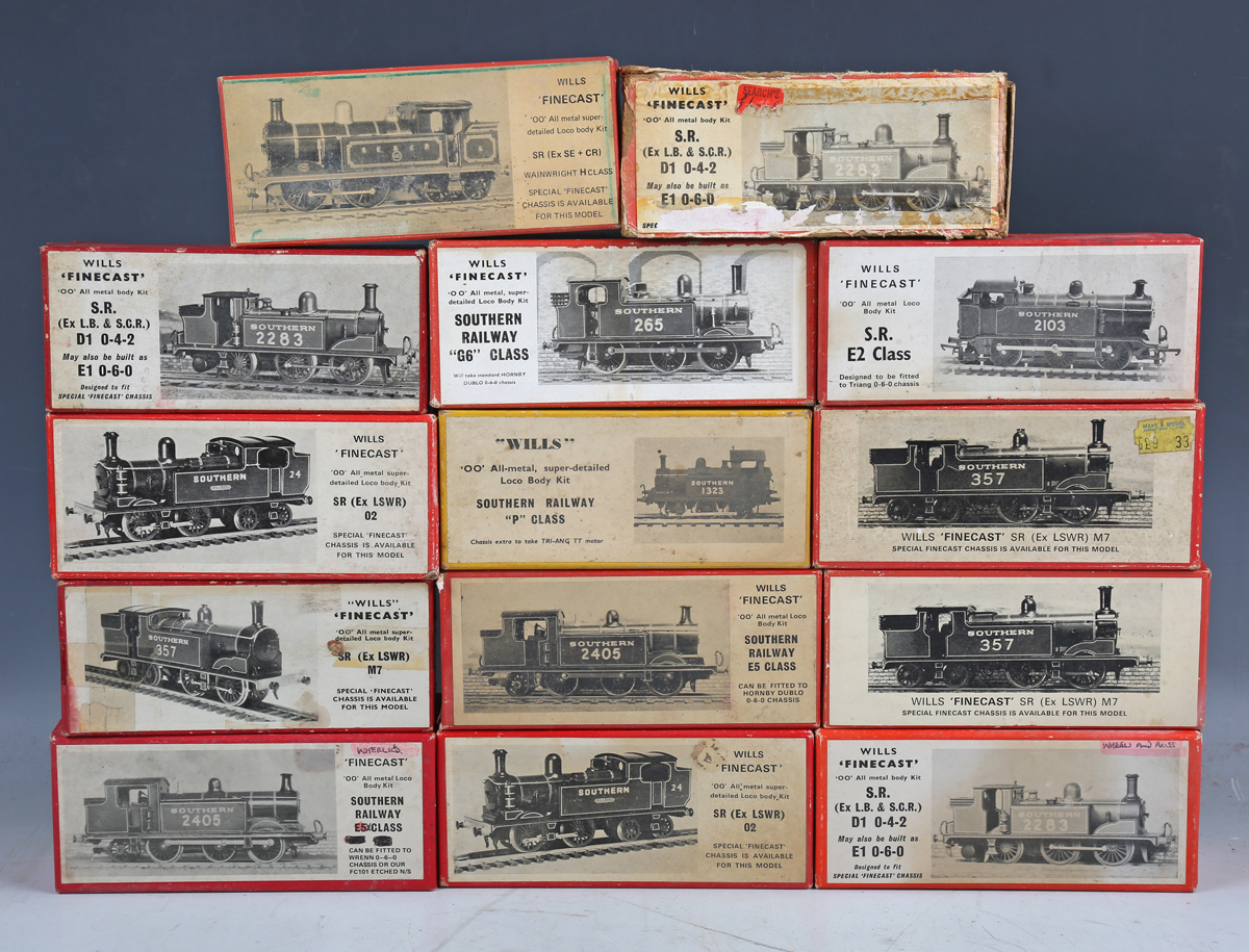 Thirteen Wills Finecast OO gauge tank locomotives, including E1 Class and E2 Class, all boxed (one built, the others unchecked, boxes torn and scuffed).
