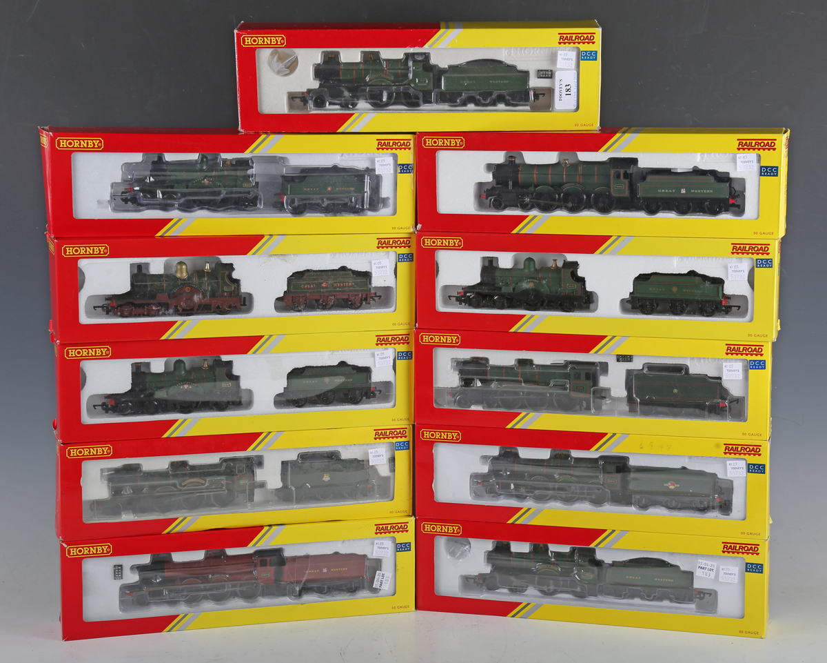 Eleven Hornby Railroad OO gauge locomotives and tenders, comprising R.3277 3835 'County of Devon', R.3499 6947 'Helmingham Hall', R.3279 'County of Hants', R.3759 3031 'Achilles', R.3170 4901 'Adderley Hall', R.3061 'County of Bedford', R.3169 5972 'Olton Hall', R.2090 4073 'Llanstephan Castle', 3047 'Lorna Doone', 3050 'Royal Sovereign' and 3012 'Great Western', all boxed.