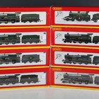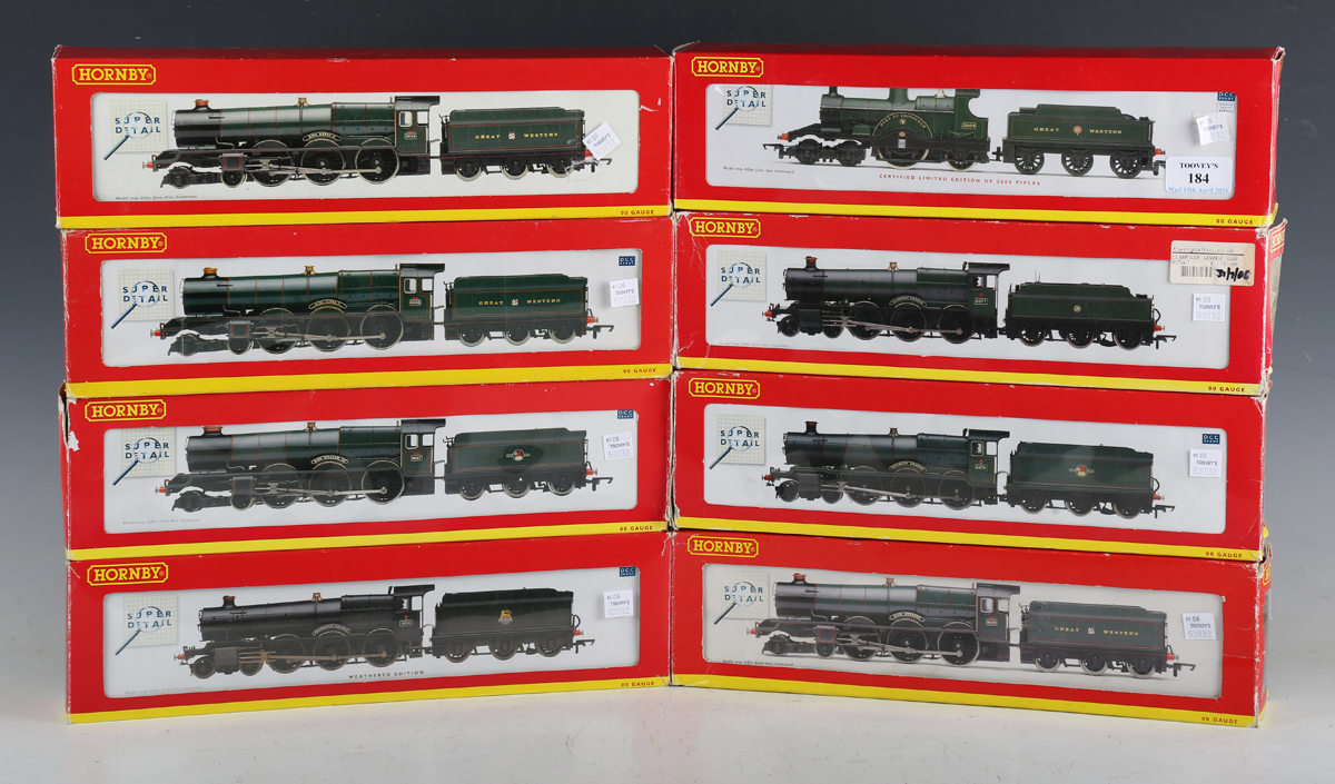 Eight Hornby Super Detail OO gauge locomotives and tenders, comprising R.2390 'King Henry II', R.2502 'Overton Grange', R.2460 'King James II', R.2530 'King William III', limited edition R.2828 3064 'Duke of Edinburgh', R.2548 6816 'Frankton Grange' (weathered edition), R.2547 6877 'Llanfair Grange' and R.2233 'King Stephen', all boxed (boxes creased, torn and scuffed).
