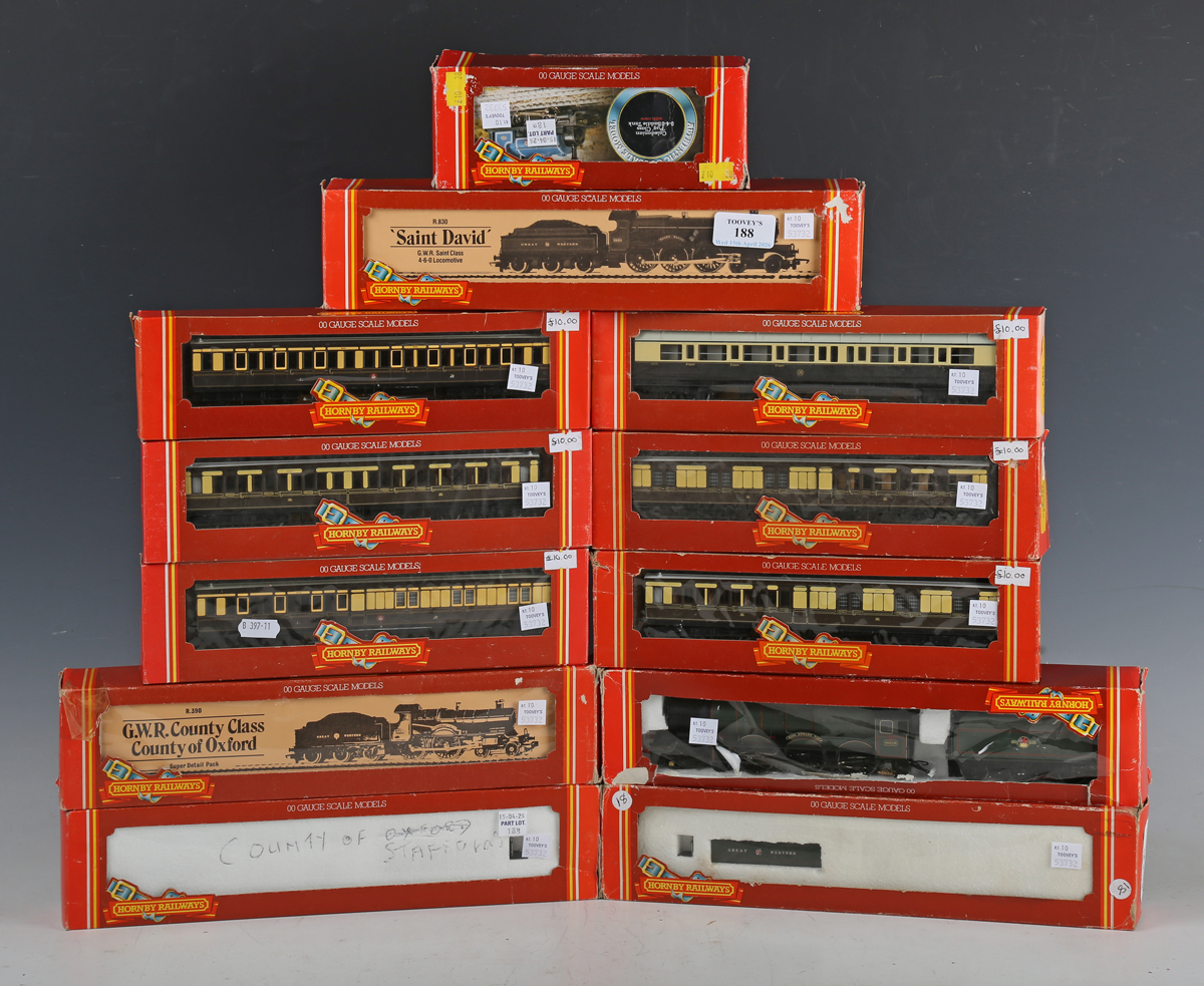 Five Hornby Railways OO gauge locomotives and tenders, comprising R.830 'Saint David', R.390 'County of Oxford', 'King Edward VIII', 'County of Stafford' and 'County of Denbigh', together with an R.057 Caledonian saddle tank locomotive in CR livery and six coaches in GWR brown and cream livery, all boxed (some boxes incorrect and damaged).
