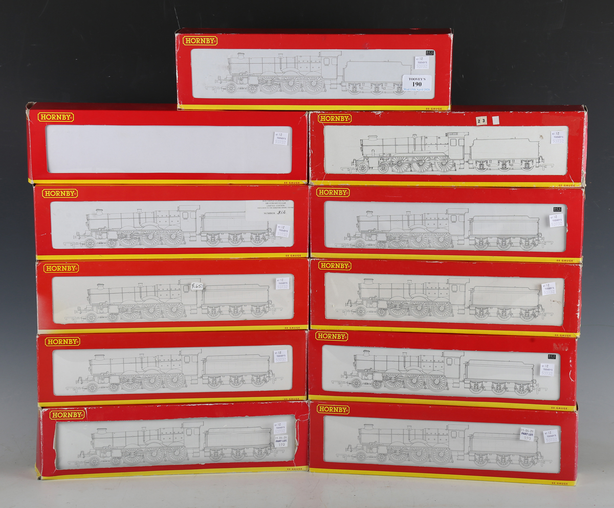 Eleven Hornby OO gauge Castle Class locomotives and tenders, comprising 5007 'Rougemont Castle', limited edition R.2432A 'Sir Edward Elgar', R.2318 5071 'Spitfire', R.2551 5077 'Fairey Battle', R.2280 'Blenheim Castle', R.2459 'Wellington', R.2489 5068 'Beverston Castle', R.2389 4086 'Builth Castle', R.2317 4093 'Dunster Castle', R.2994 7029 'Clun Castle' and R.2543 4081 'Warwick Castle'.