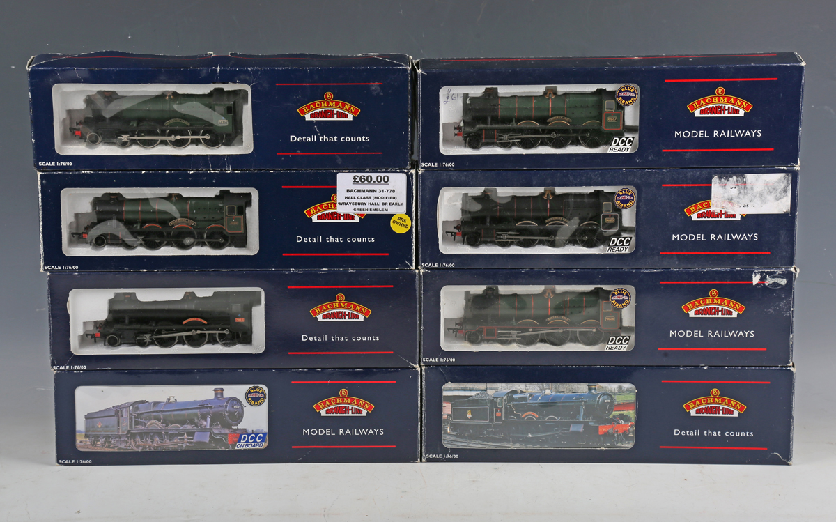 Sixteen Bachmann Branch-Line OO gauge locomotives and tenders, including No. 31-308 7825 'Lechlade Manor', No. 31-776 Modified Hall Class 7915 'Mere Hall' and a Prairie tank locomotive, all boxed, and two further Manor Class locomotives, within stock boxes.