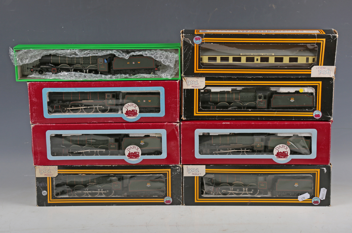 Seven Dapol OO gauge locomotives and tenders, including D005 'Dorchester Castle', 'County of Stafford' and 'Swindon', six boxed, and a coach in brown and cream livery (boxes creased and scuffed).