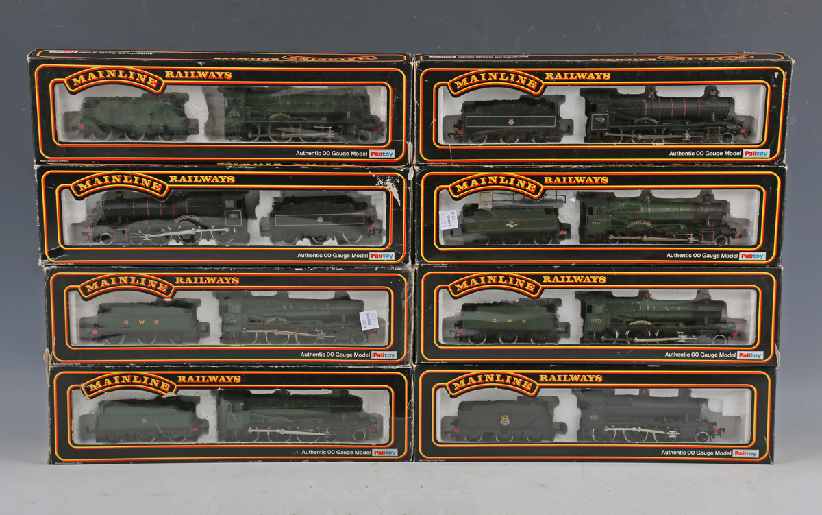 Twelve Mainline Railways OO gauge locomotives and tenders, including No. 37091 43XX Mogul 5328 in BR black and No. 37-079 'Odney Manor', and seven coaches in GWR brown and cream, all boxed.