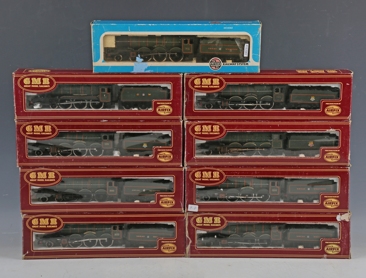 Six Airfix Railway System and Airfix GMR locomotives and tenders, including Castle Class No. 54125-5 'Pembroke Castle' and No. 54124-2 'Eastnor Castle', and seven coaches in GWR brown and cream, boxed, five in stock boxes (boxes creased, torn and scuffed).