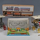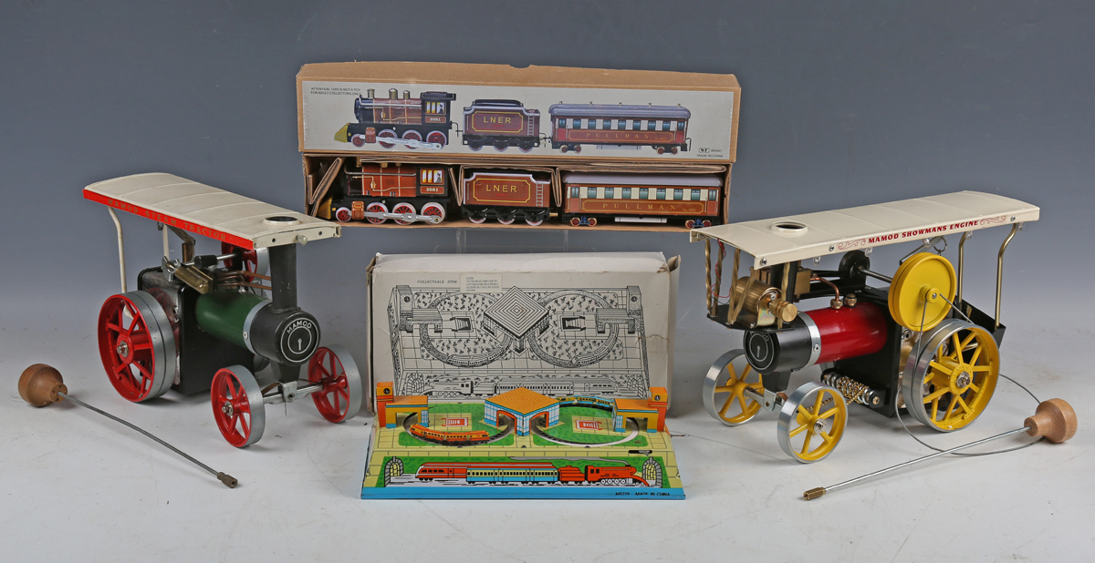 A Mamod live steam showman's engine, finished in yellow and black with yellow spoked wheels, boxed with instructions, together with a Mamod traction engine, a stationary steam engine, a power hammer and three tinplate toys.