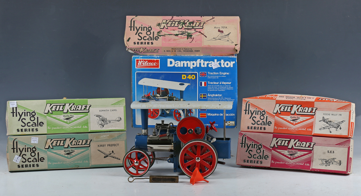 A Wilesco D40 traction engine, boxed with funnel and instructions, together with five Keil Kraft balsa wood model aircraft kits, comprising Avro 707A, Sopwith Camel, Focke Wulf 190, SE5 and Kirby Prefect, all boxed with instructions (unchecked, boxes creased, torn and scuffed).