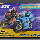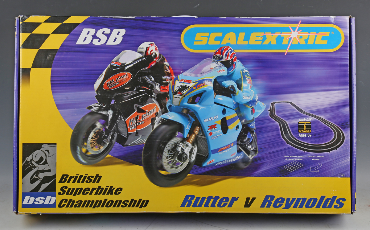 A Scalextric British Superbike Championship set Rutter vs Reynolds, boxed (contents still sealed), together with a Scalextric C6020 Valentino Rossi Yamaha, boxed, a Valentino Rossi Honda, a Max Biaggi Honda, a lap counter and track.
