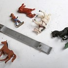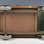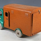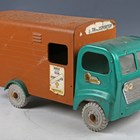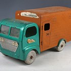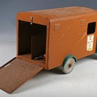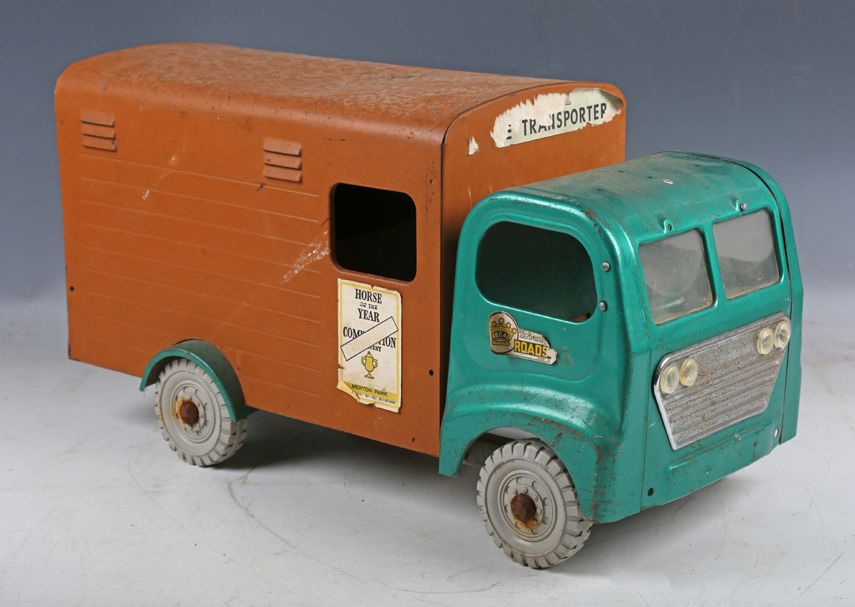A Tri-ang pressed steel horse transporter truck, finished in metallic green and brown, length 46cm (playwear and rust spots).