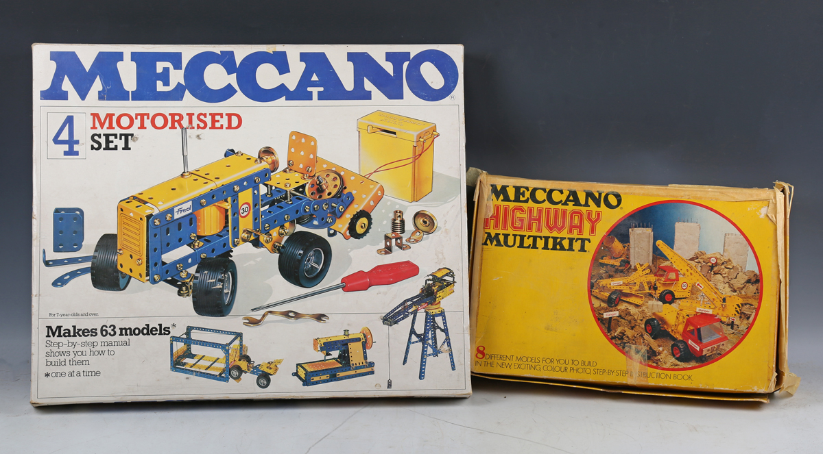 A collection of Meccano, including No. 4 Motorised Construction Set, Highway Multikit set and various other parts (unchecked), together with a group of Tri-ang Railway OO gauge model railway items and track (playwear).