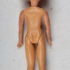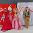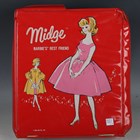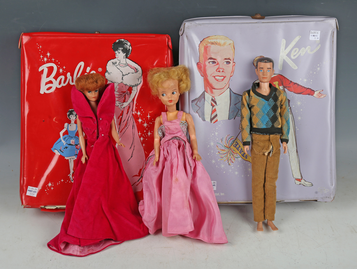 Three 1960s Mattel dolls, comprising Barbie with short auburn hair, Ken with moulded brown hair and Midge with auburn hair, each with wardrobe carry case and clothes, together with a Sindy doll with associated clothes (small fingers on Midge and Barbie damaged, clothes and cases also damaged).
