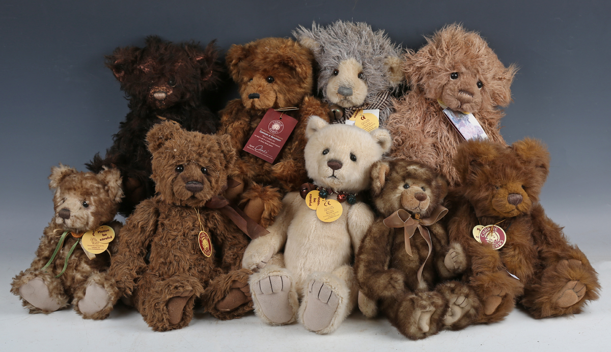 Nine Charlie Bears, comprising CB614859 Bruno, CB114883A Anniversary Jack, limited edition of 6000, CB193905D Stevie, limited edition 2423/2500, SJ3769 Chocolate Fondue, limited edition 233/500, CB131313 Blizzard, CB083796 Kelsey, CB194513 Button, CB125147B Farthing and CB114757 Charlie 2011, all with tags.