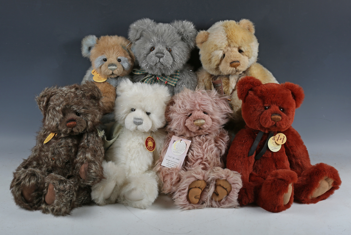 Seven Charlie Bears, comprising CB0104582 Rusty, CB614923 Snowflake, CB131305 Kiya, CB125089 Little Gem, limited edition 447/1000, CB124946 Dilly, CB141495 Sonny and CB604769 Star, all with tags.