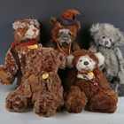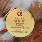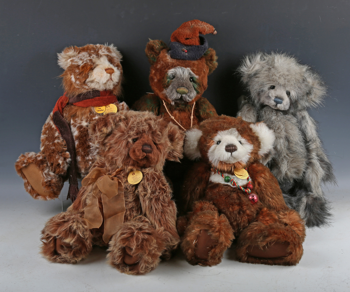 Five Charlie Bears, comprising CB614844 Tabrum, CB625132 Howard, CB604831 Pudding, CB631474 Mince Pie and CB621333 Noel, all with tags.