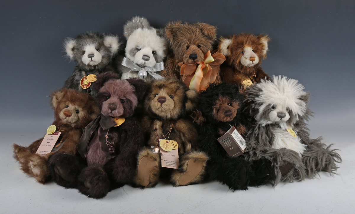 Nine Charlie Bears, comprising CB114767 Yvette, CB141450A Fidget, CB194403A Rhubarb, limited edition 6133/7000, CB14999 Plum Pudding, CB104716A Becky, CB194403B Crumble, limited edition 6133/7000, CB604763 Tinsel, CB104716C Fuddy and CB194342 Ella, all with tags.