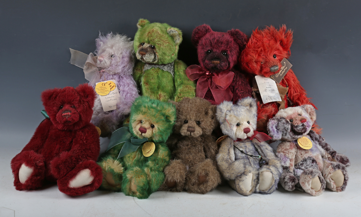 Fourteen Charlie Bears, comprising CB621373 Bauble, CB094080A Ruby, CB604748C Ragsy, CB604775 Cranberry, CB104693 Laura, CB1104664 Wurve You, limited edition 4279/6000, CB630036B Bibble, limited edition1315/1500, CB631486 Brussell, CB114789 Kitty, CB094079B Alice, CB604774 Sprout, CB SJ4545 Hazel, limited edition 52/200, Charlie 2014 Mohair Year Bear, limited edition 158/1200, and SJ5122 Enzo, limited edition 136/500, all with tags.