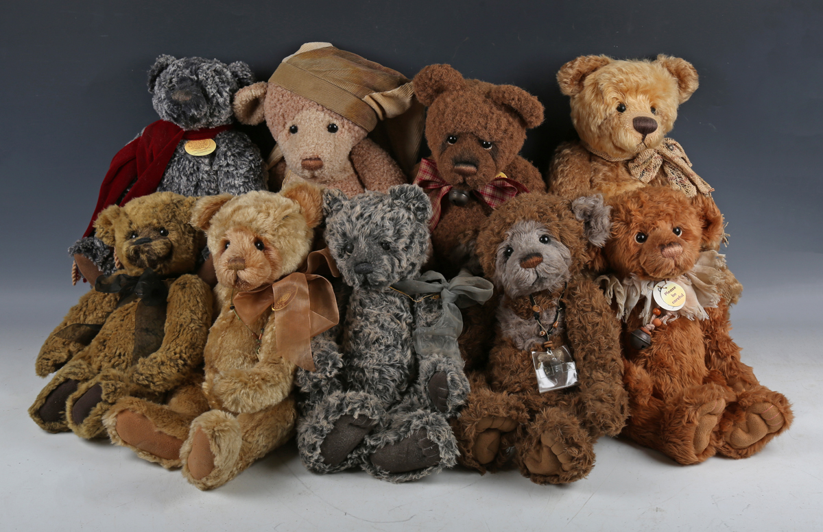 Nine Charlie Bears teddy bears, comprising CB124976 Figaro, CB625147A Tink, CB114807 Parkin, CB125001 Ridley, CB094100 Isaac, CB131399A Chip, CB114884 Anniversary Thomas, SJ3654 Miming, all with tags, and Torquil (no tag).