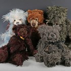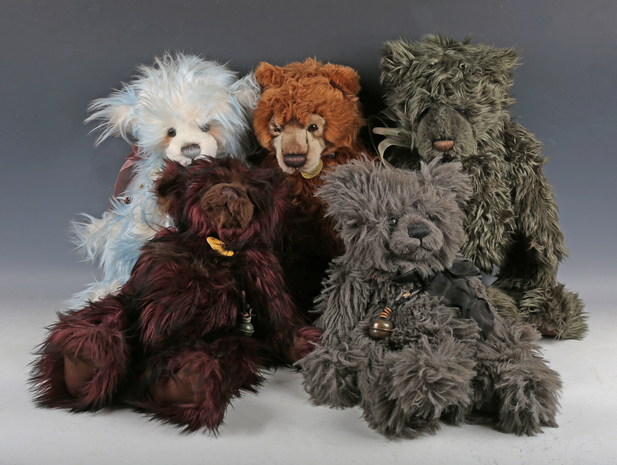 Five Charlie Bears teddy bears, comprising CB094087 Kojak, CB124991 Brunswick (tag signed), CB114802 Merlin, CB625136A Elderberry and CB125000 Celeste.