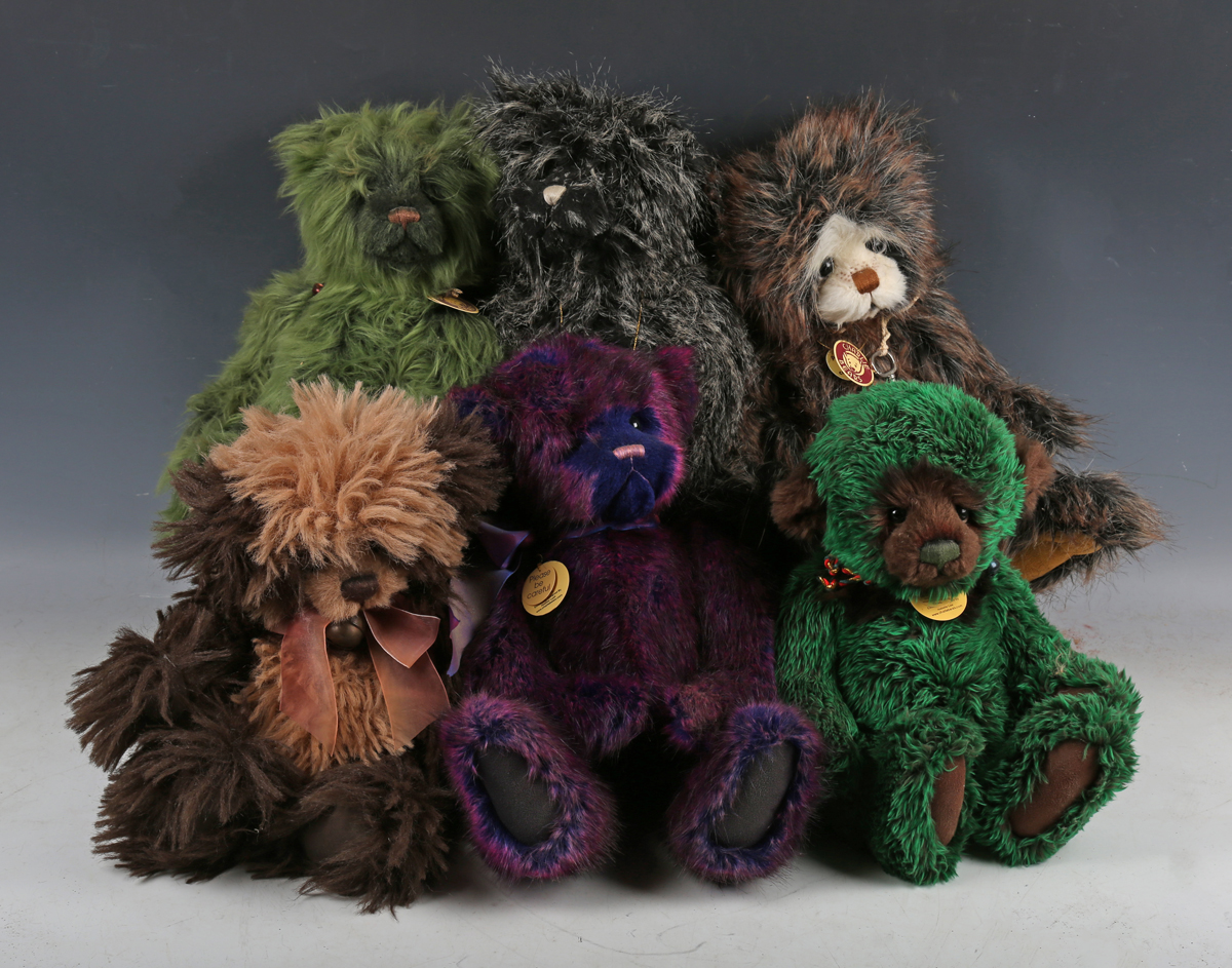 Six Charlie Bears teddy bears, comprising CB20001 Firework, CB621344 Spruce, CB141226B Pixel, limited edition 439/1000, CB194548 Freckles, CB114766 Phoenix and CB621365 Hollyberry, all with tags.