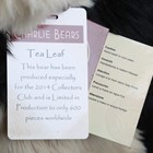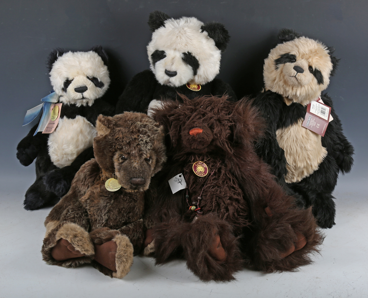 Five Charlie Bears teddy and panda bears, comprising CB141479 Tea Leaf, CB131394 Monium, CB604662 Ming, limited edition 2278/4000, CB124896 Wojtek (tag signed) and CB131337 Valentino, all with tags.