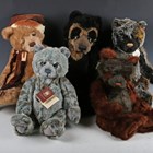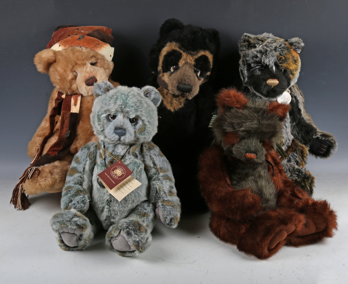 Five Charlie Bears teddy bears, comprising CB625131B Wotsit, CB141447 Alicia, CB621390 Santa Paws, CB104730 Griffin and CB104654 Shades, all with tags.