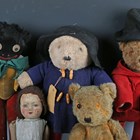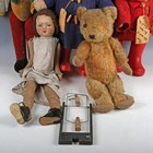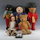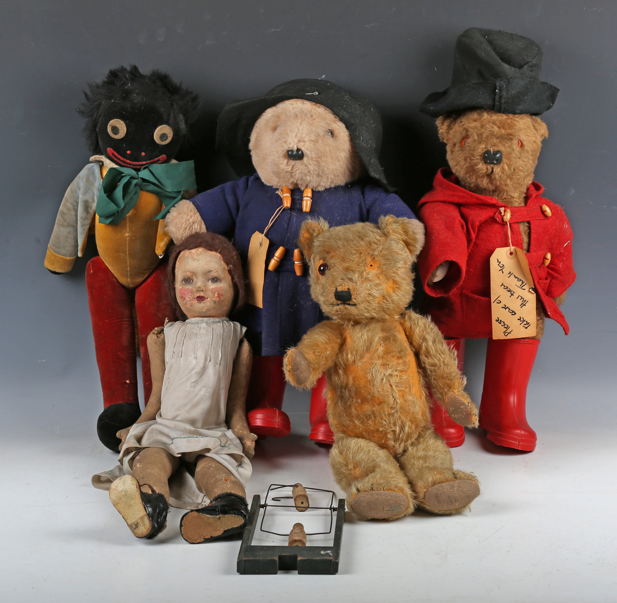 A Chiltern mohair hump back teddy bear with stitched snout and claws, height 49cm, together with a Chad Valley golly, a Chad Valley doll, two Paddington Bears and an acrobatic toy (playwear, faults and parts missing).