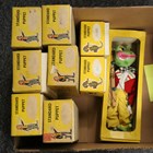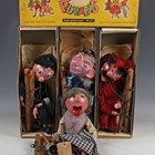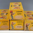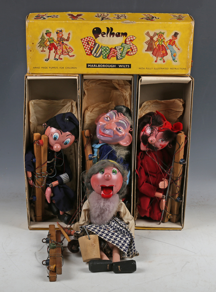 Thirteen Pelham Puppets, comprising Devil, Bimbo The Clown, Old Lady, Gepetto, Mac Boozle, Ballet Girl, Policeman, Wizard, Snake Charmer, Poodle, Frog, Cat and Bengo, all boxed (some playwear, boxes lightly creased and scuffed).