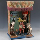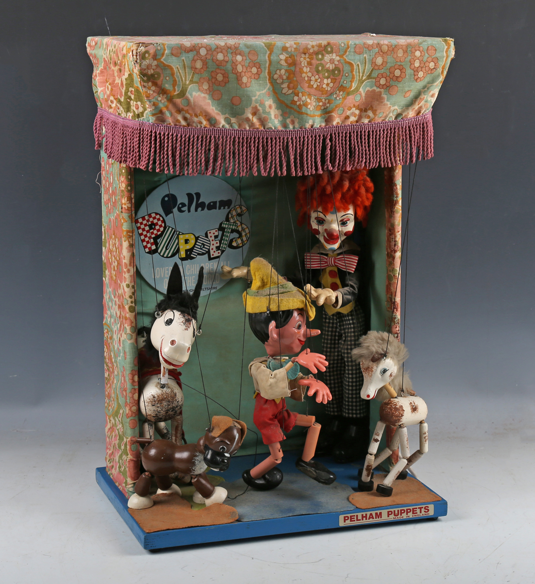A Pelham Puppets electrically operated shop window display, containing Bimbo, Pinocchio, Horse, Foal and Bengo, the back drop applied with a Pelham Puppets circular card plaque, height 54cm, width 35cm, depth 25cm (some wear to fabric surround and base).