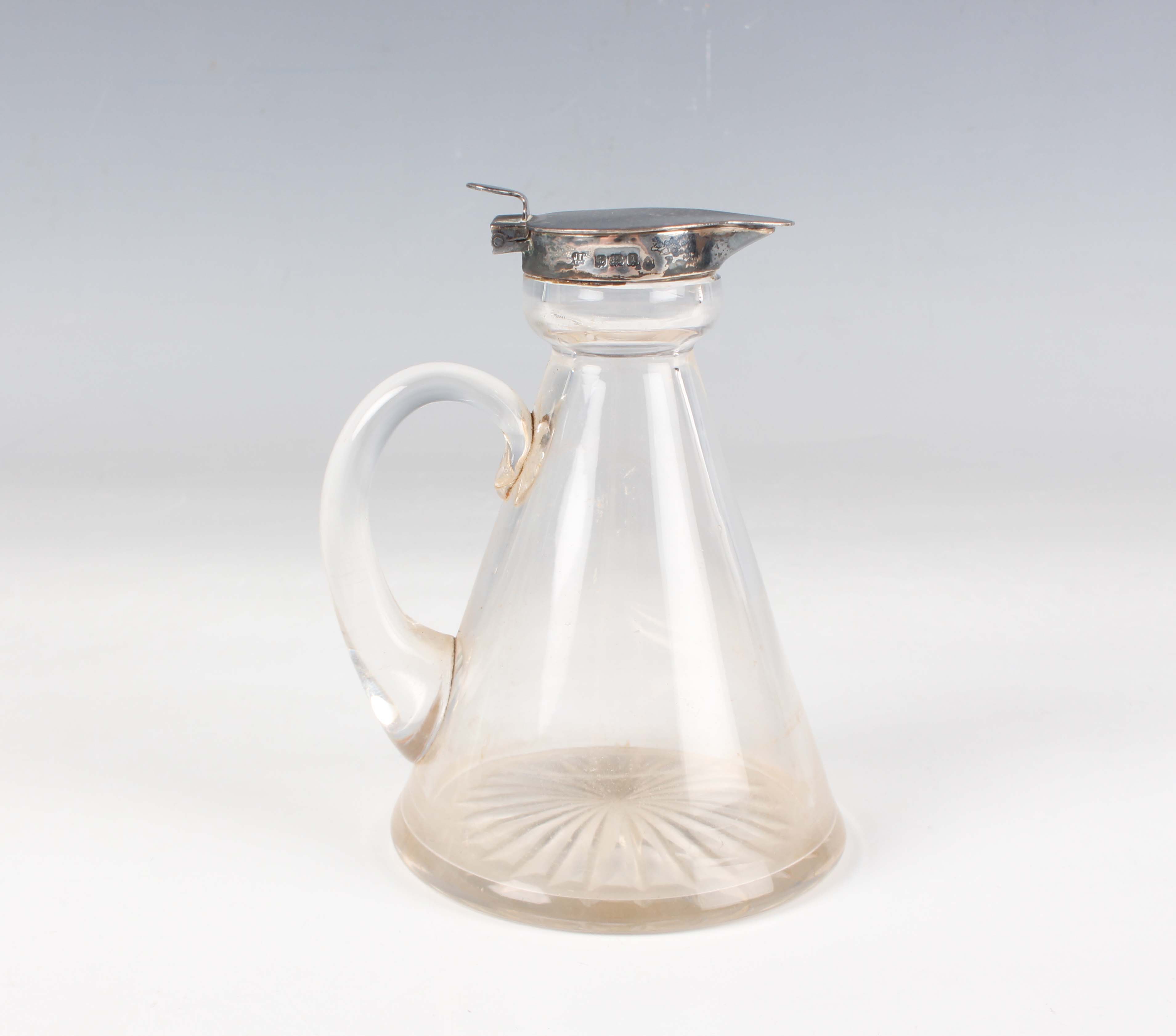 An Edwardian silver mounted conical glass whisky tot, Birmingham 1908 by Hukin & Heath, height 10.8cm.
