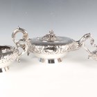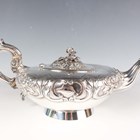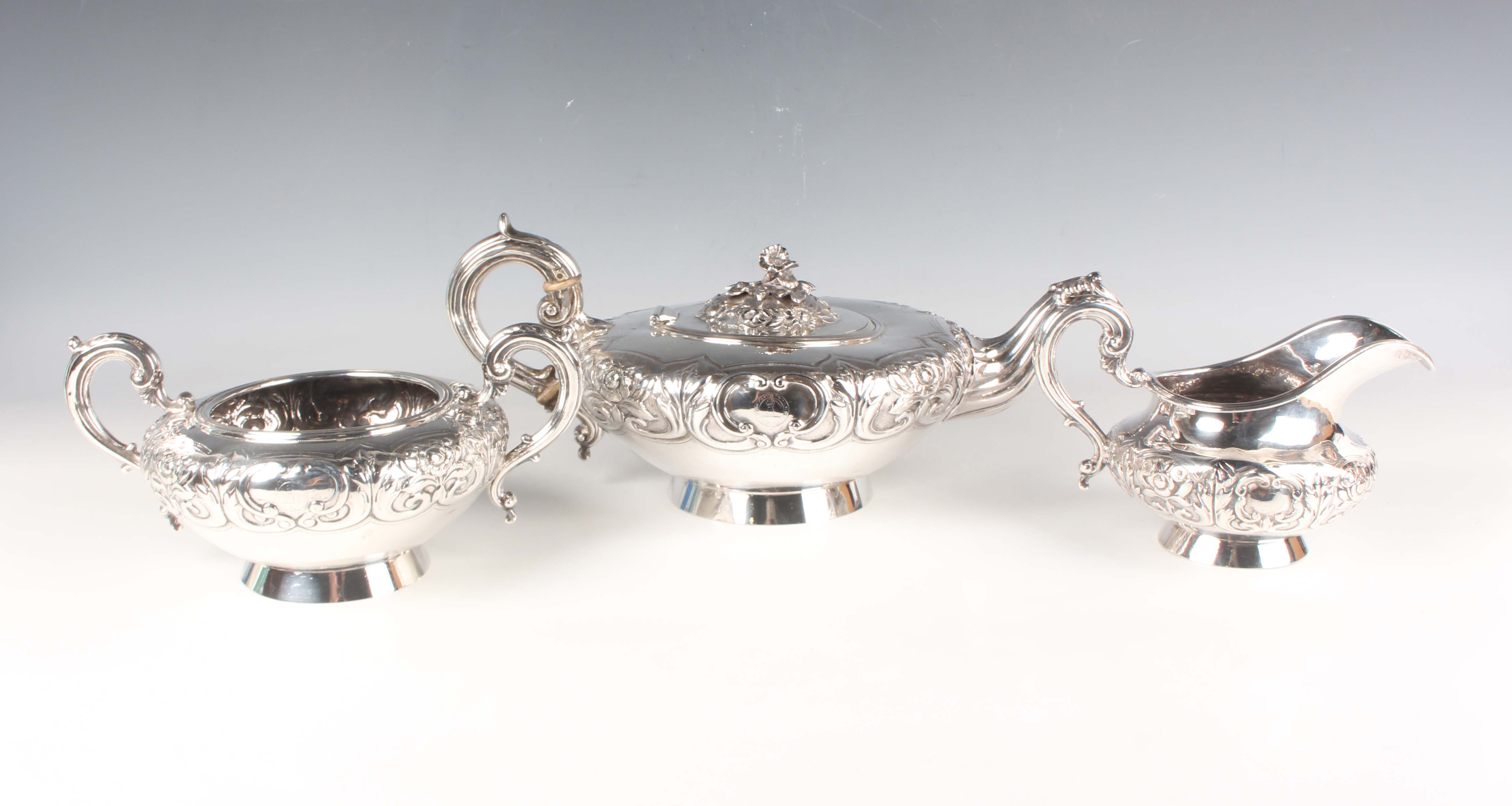 A William IV Irish silver three-piece tea set of squat circular form, chased with a band of flowers and leaves, presentation and crest engraved, comprising teapot with flower and leaf stem finial, flanked by a reeded scroll spout and handle, two-handled sugar bowl and milk jug, Dublin 1835 and 1836 by James Fray, total weight 1544g, length of teapot 32cm. Note: a non-transferrable ivory exemption certificate has been granted for the sale of this item.