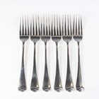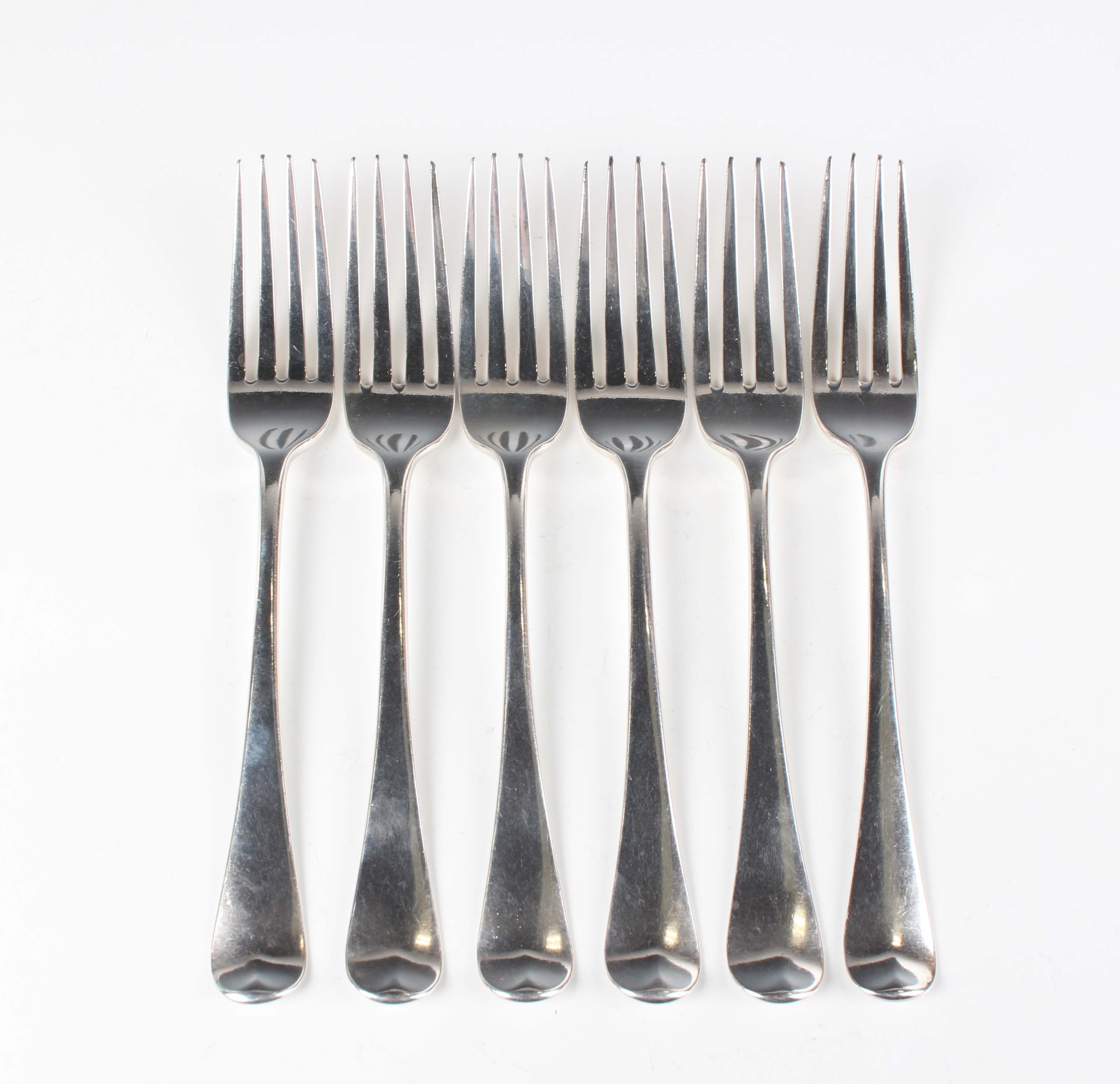 A set of six George III silver Hanoverian pattern table forks, London 1805 by Richard Crossley, total weight 401.7g, length 20cm.