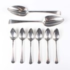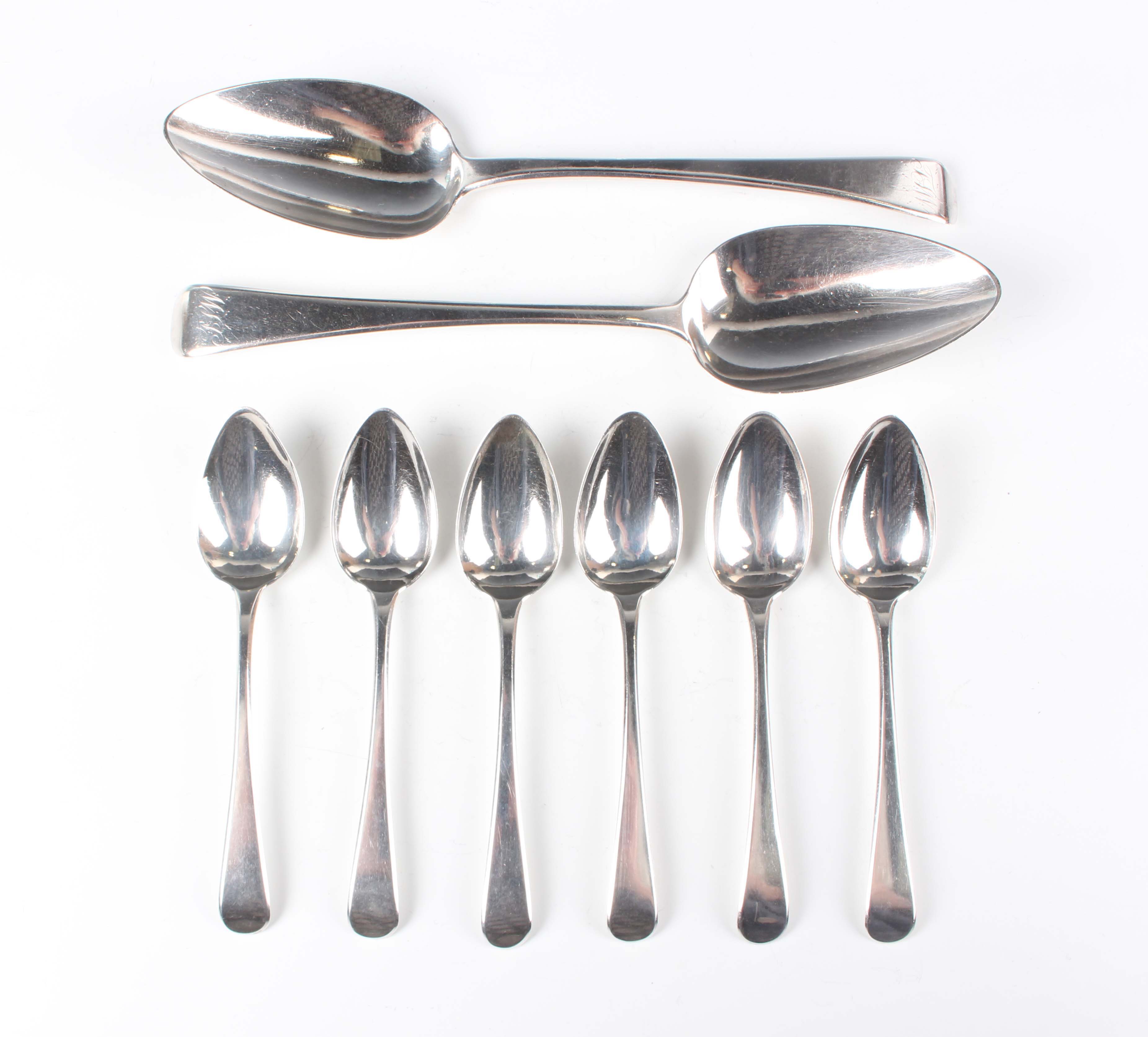 A pair of George III silver Old English pattern tablespoons, London 1805 by John Lias, length 22.2cm, and a set of six silver Old English pattern teaspoons, London 1809 by Peter & William Bateman, total weight 233.2g.